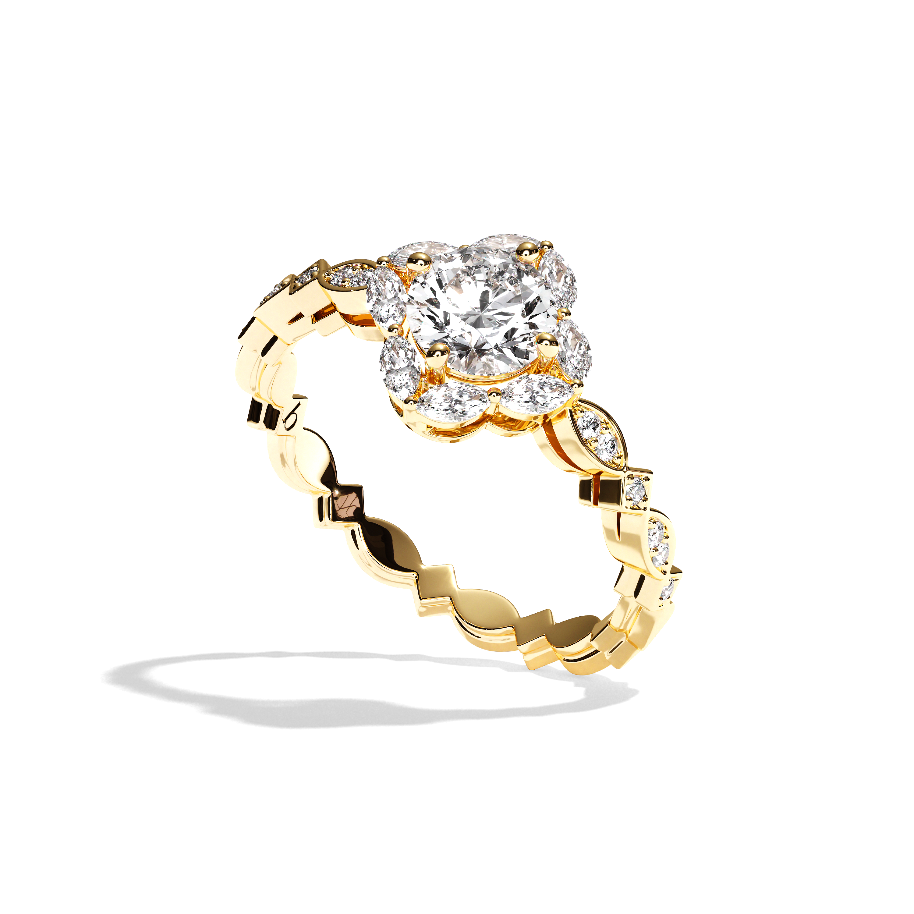 A la différence des Bagues de Fiançailles Diamants Pavées, les bagues de Fiançailles avec entourage simple ou double sont sublimées par un entourage de petits diamants. Aussi connue sous le nom de Bague de Fiançailles Halo ou Bague Solitaire Halo, cette Bague de Fiançailles apporte un éclat spectaculaire et un style luxueux.