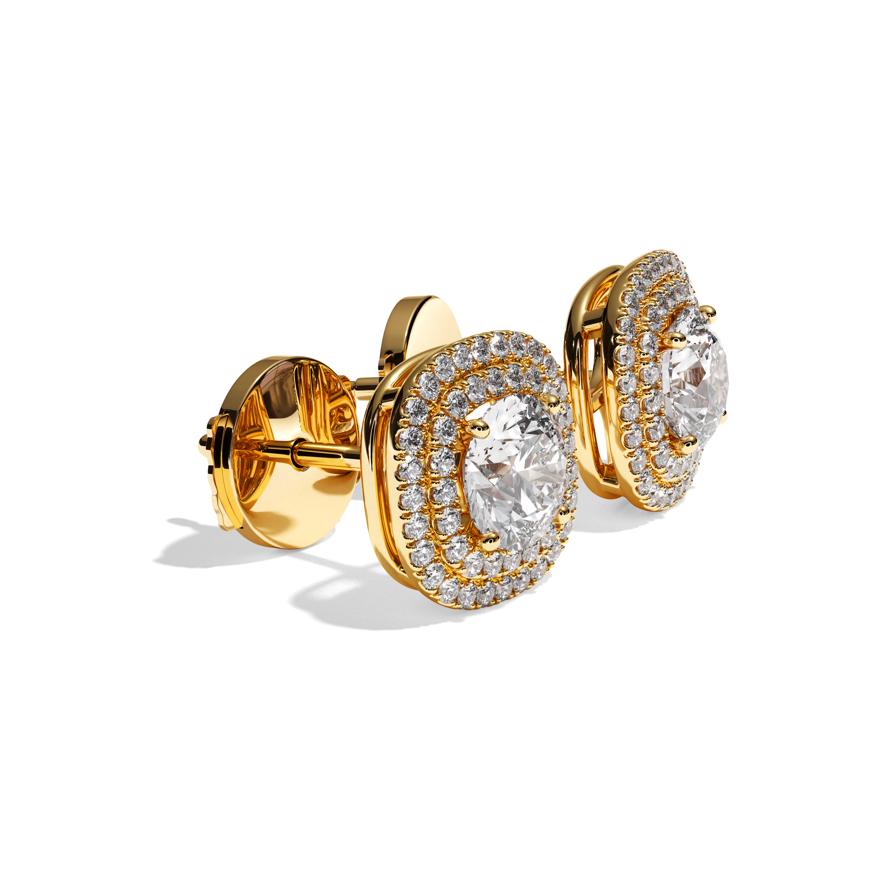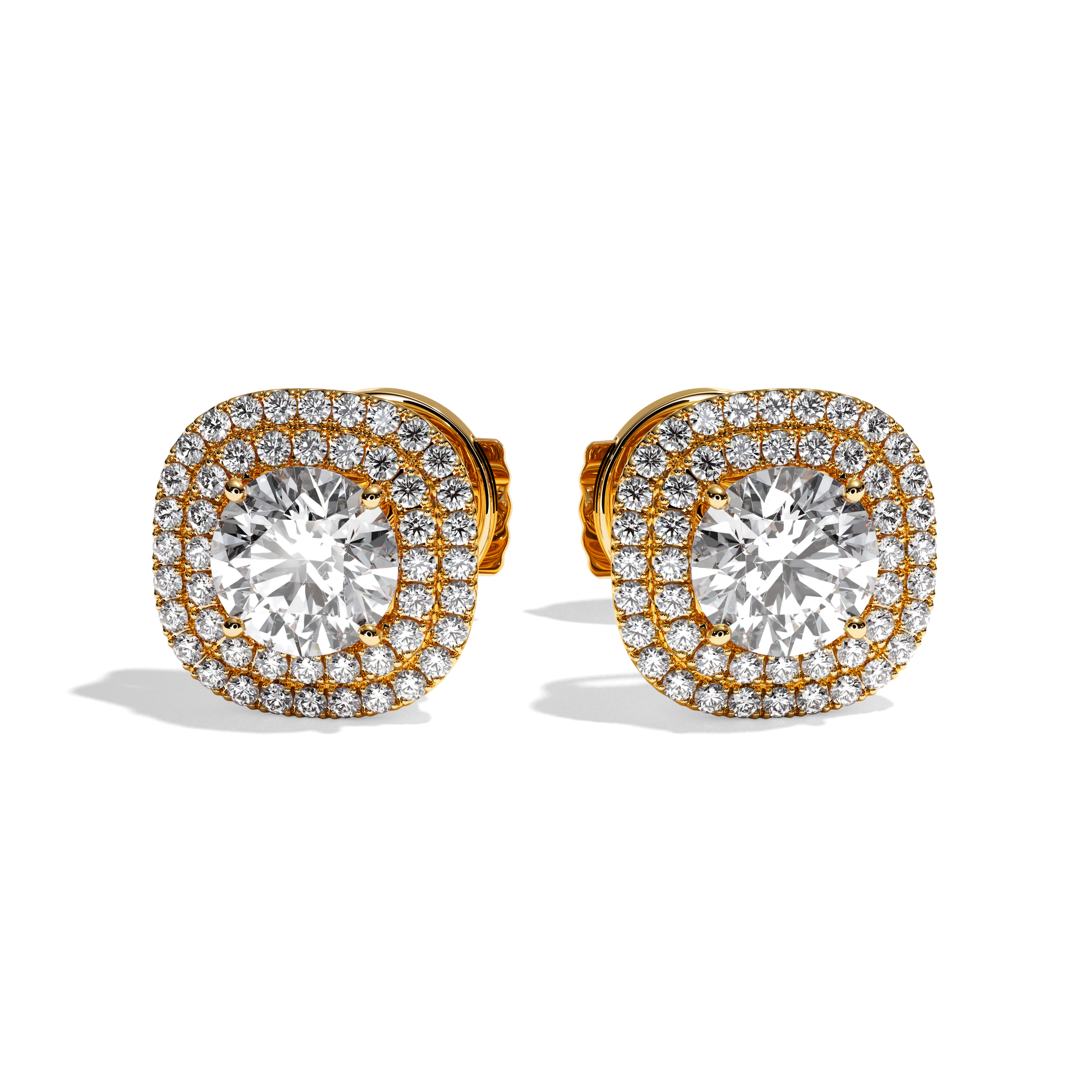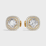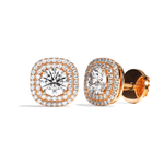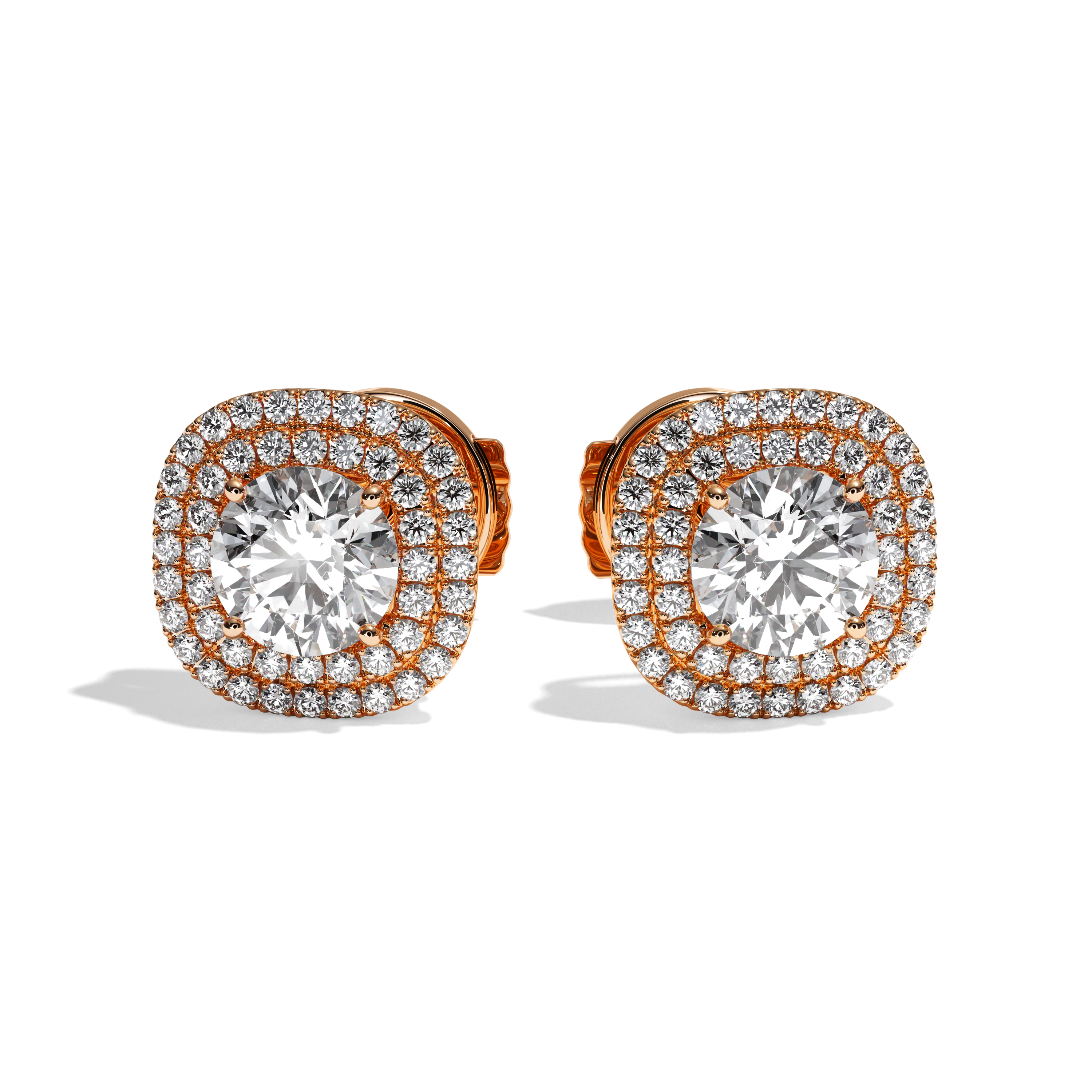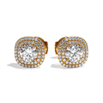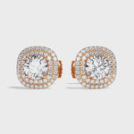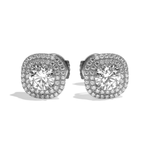 Leur sertissage dit « griffe » et « grain » souligne parfaitement le rendu taille brillant des diamants de centre et y laisse rentrer la lumière. La particularité de ce modèle est le double halo qui entoure la pierre de centre qui lui confère un rendu exceptionnel par sa forme différente : taille coussin.