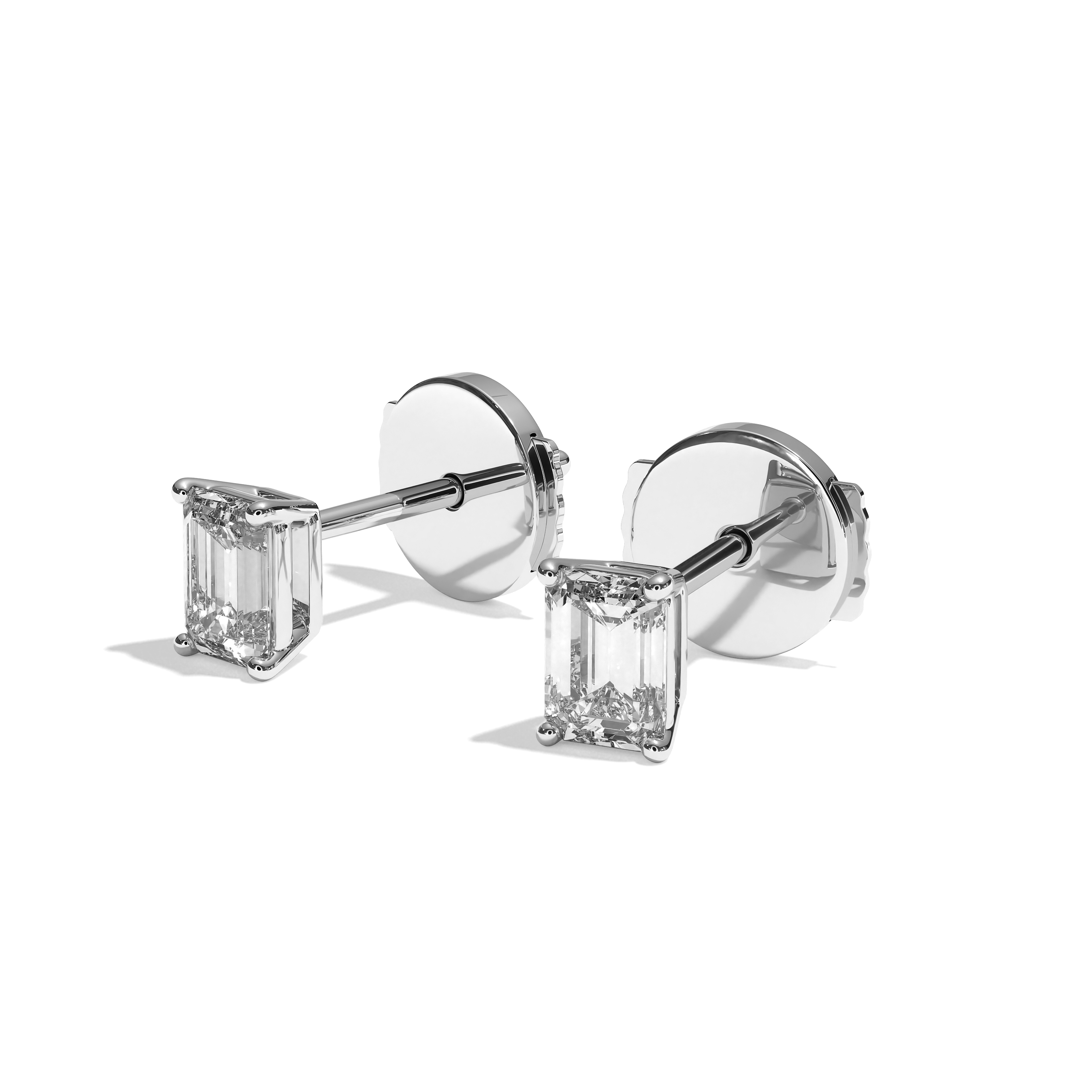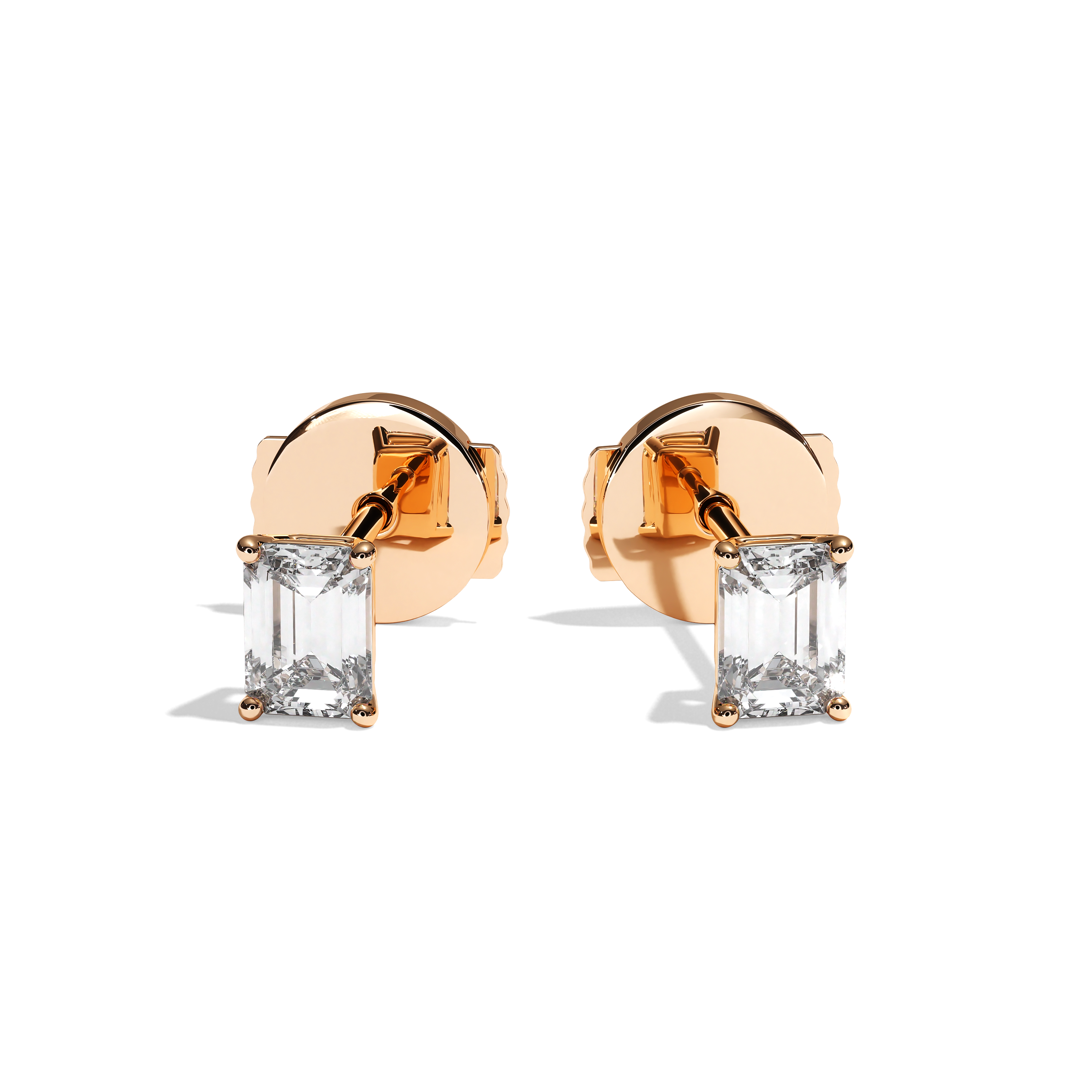 Leur sertissage dit «griffe» souligne parfaitement le rendu taille émeraude des diamants et y laisse rentrer la lumière.