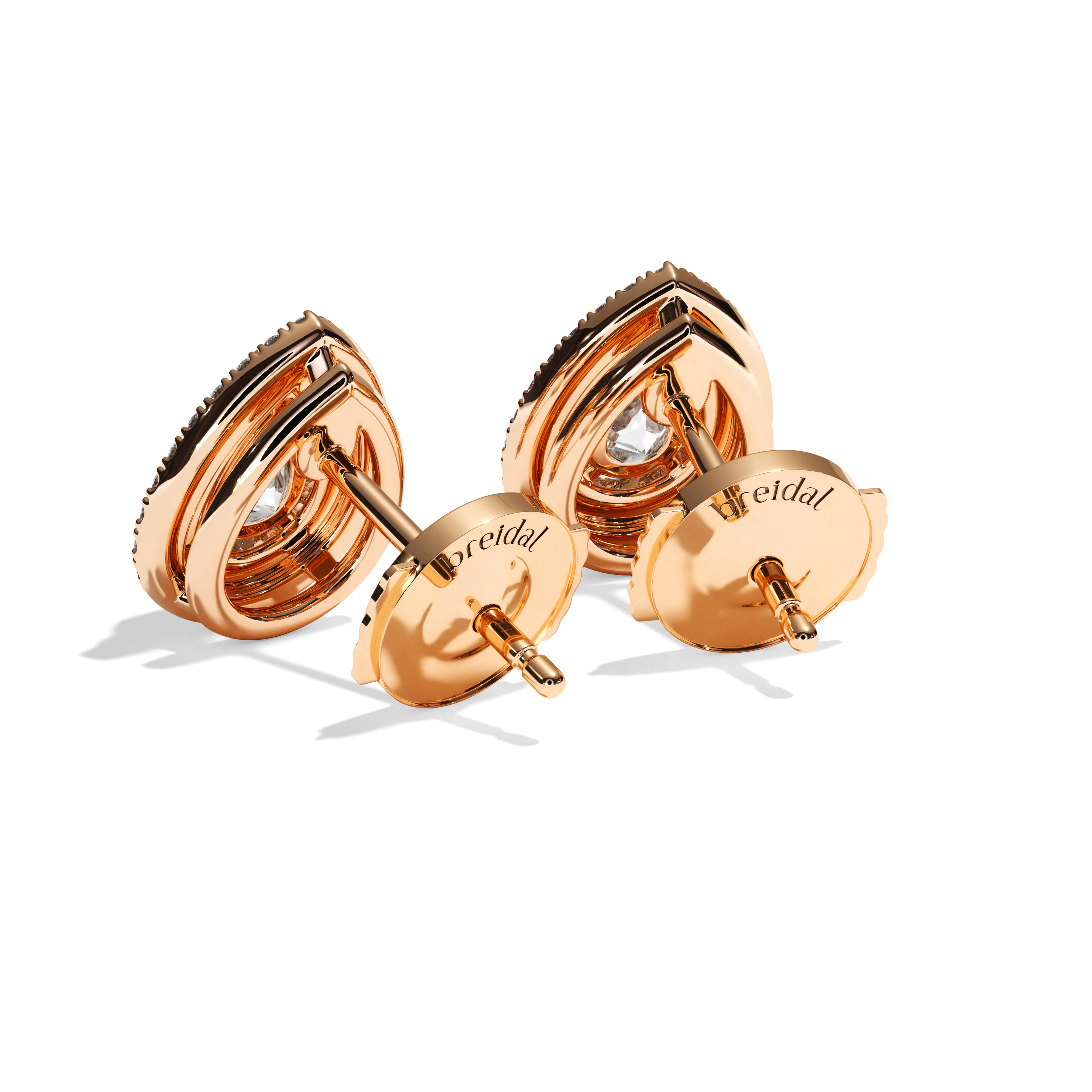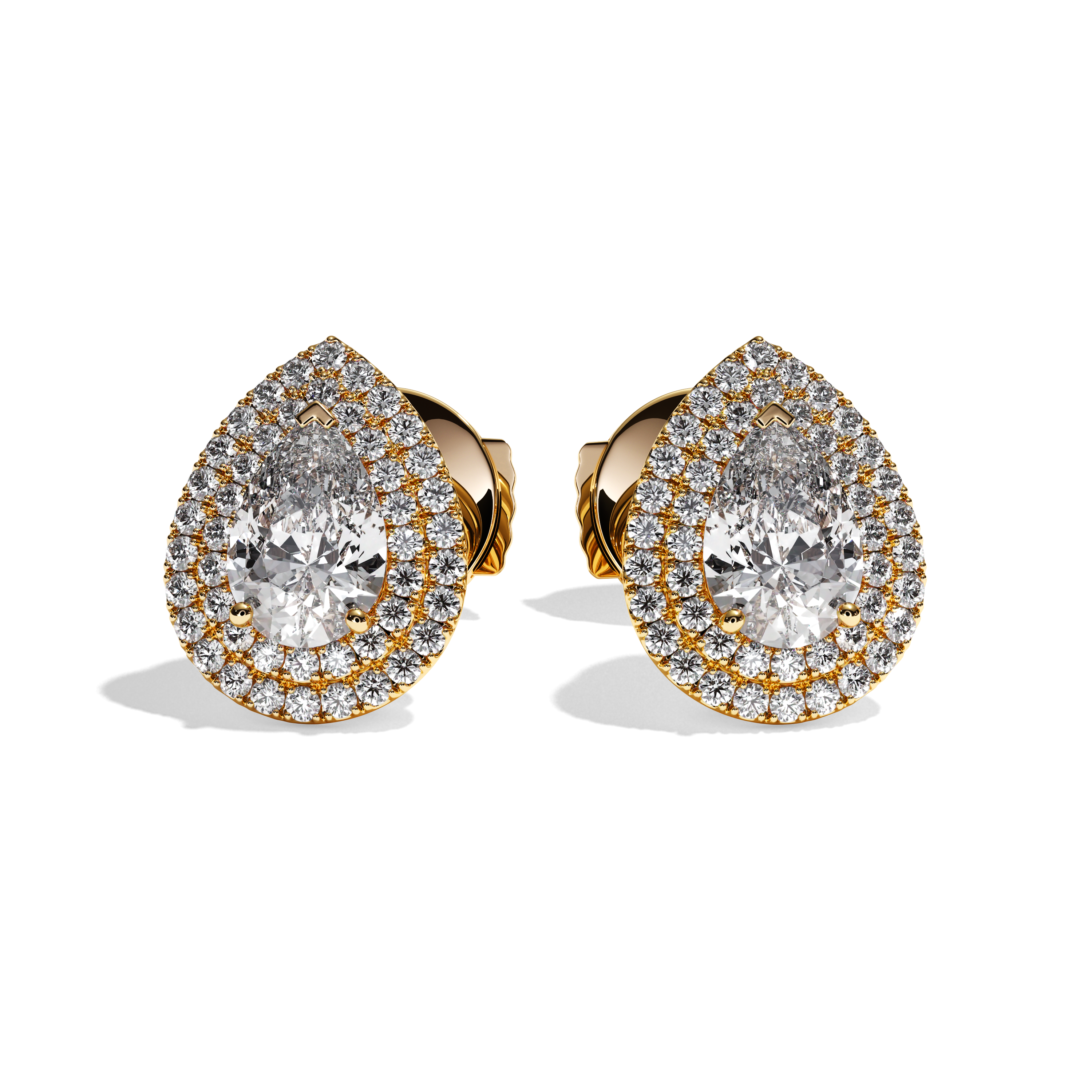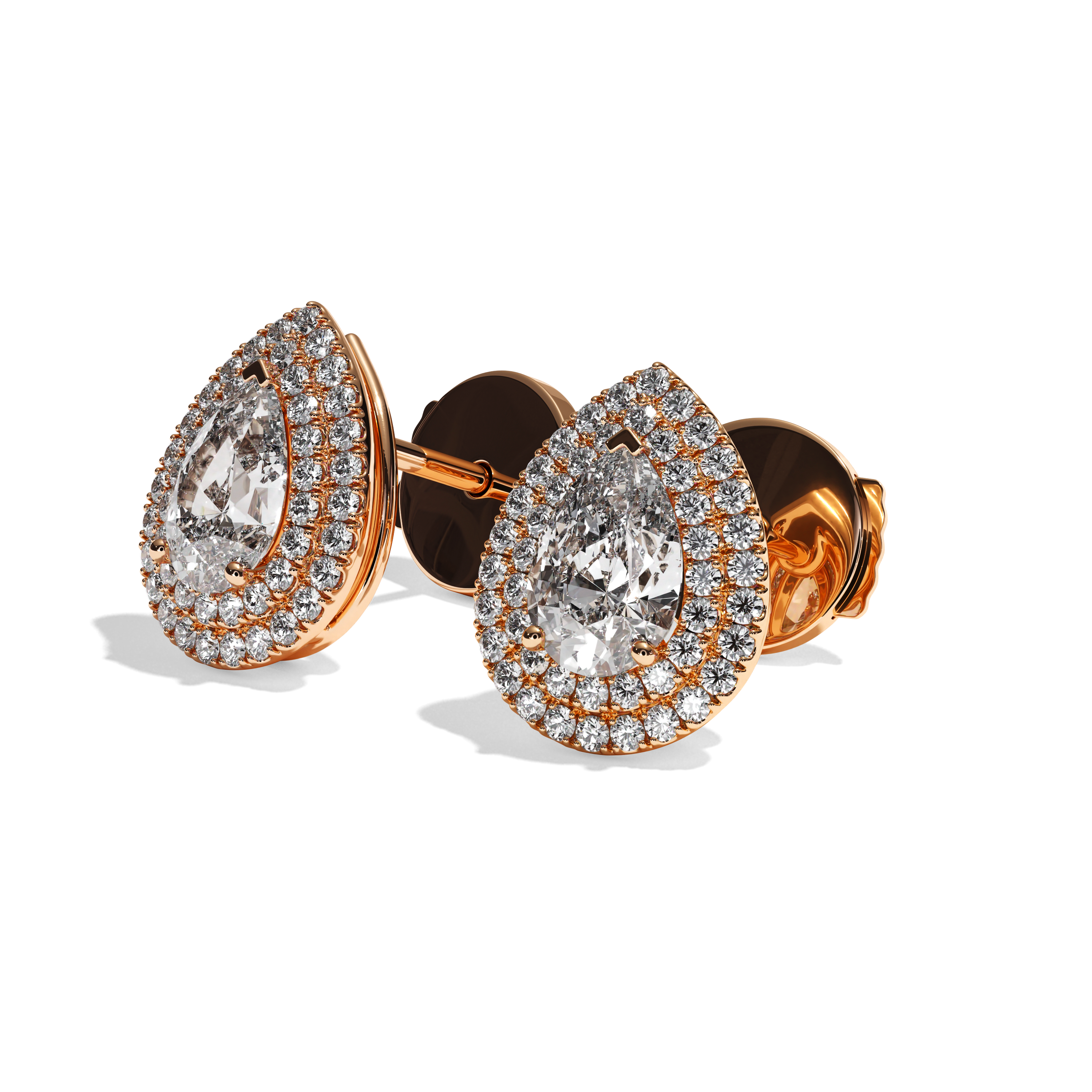 Leur sertissage dit « griffe » et « grain » souligne parfaitement le rendu taille poire des diamants de centre et y laisse rentrer la lumière. La particularité de ce modèle est le double halo qui entoure la pierre de centre qui lui confère un rendu exceptionnel. Le métal met en valeur la pierre et le système de fermoirs assure une sécurité totale.