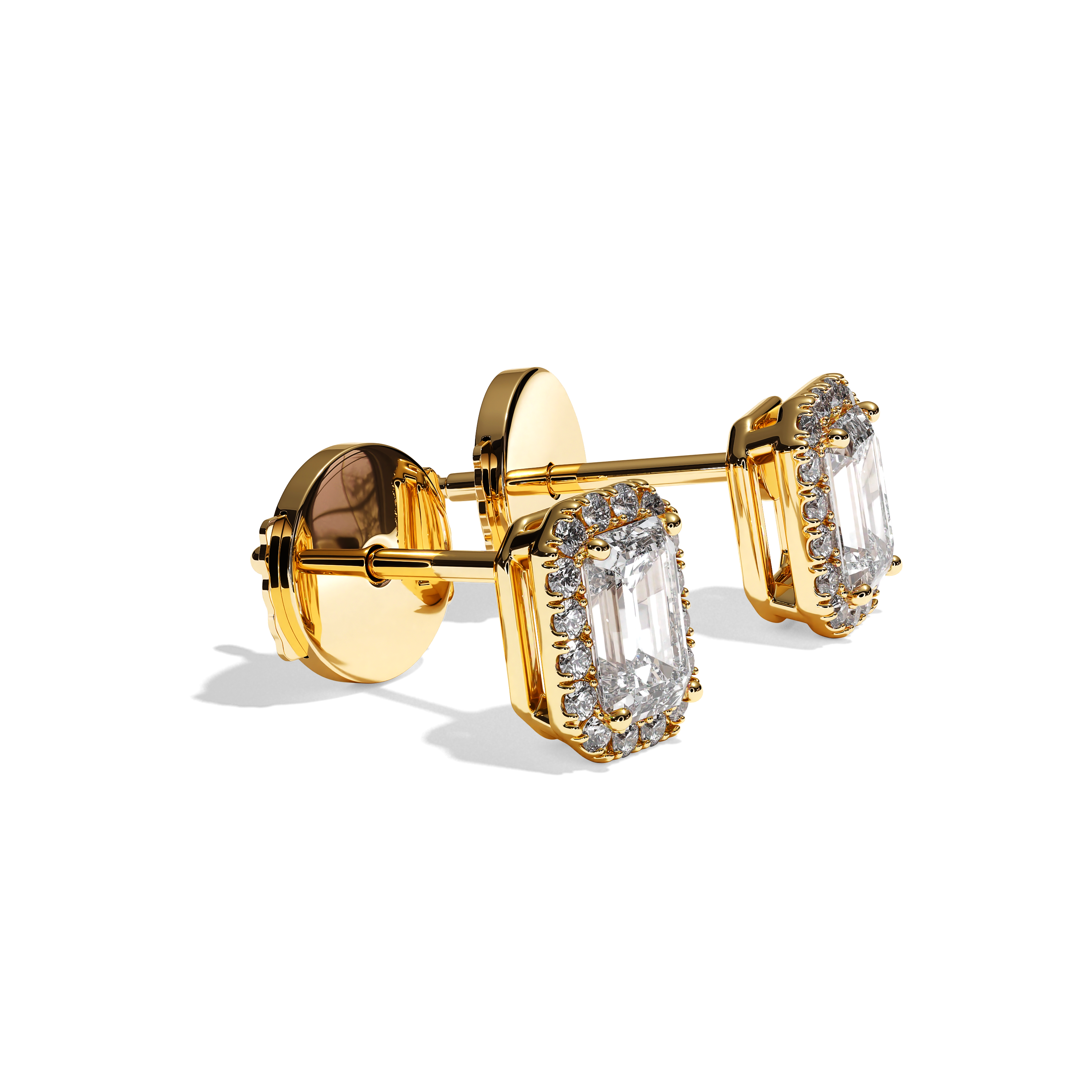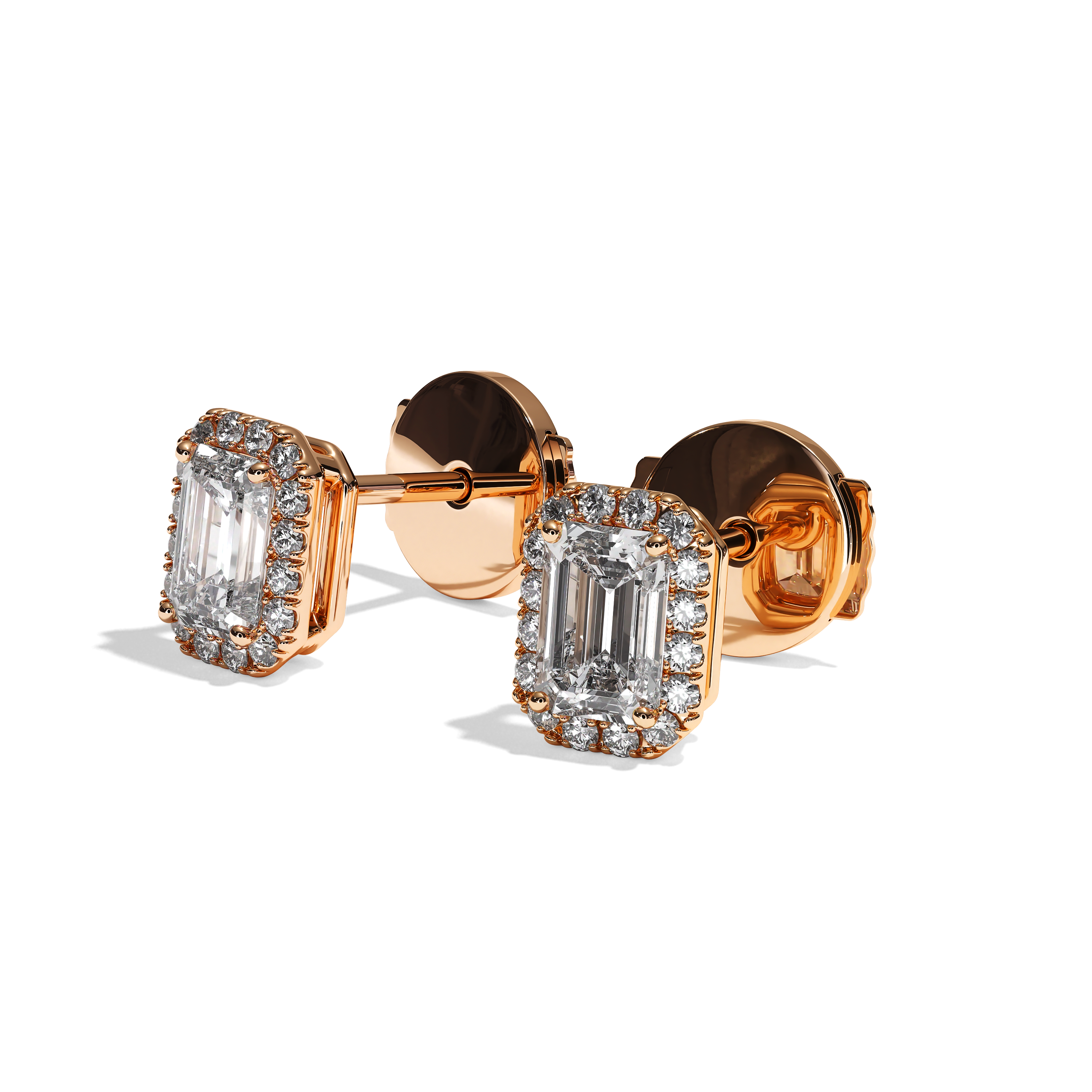 Leur sertissage dit « griffe » et « grain » souligne parfaitement le rendu taille émeraude des diamants de centre et y laisse rentrer la lumière. La particularité de ce modèle est le halo qui entoure la pierre de centre qui lui confère un rendu davantage désirable. Le métal met en valeur la pierre et le système de fermoirs assure une sécurité totale.