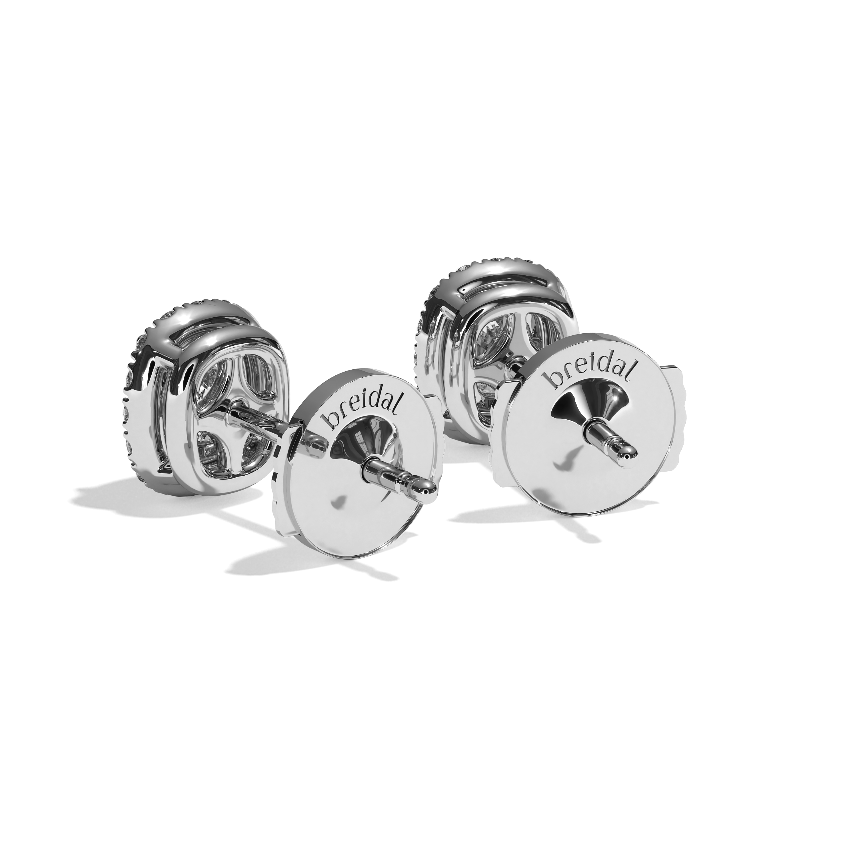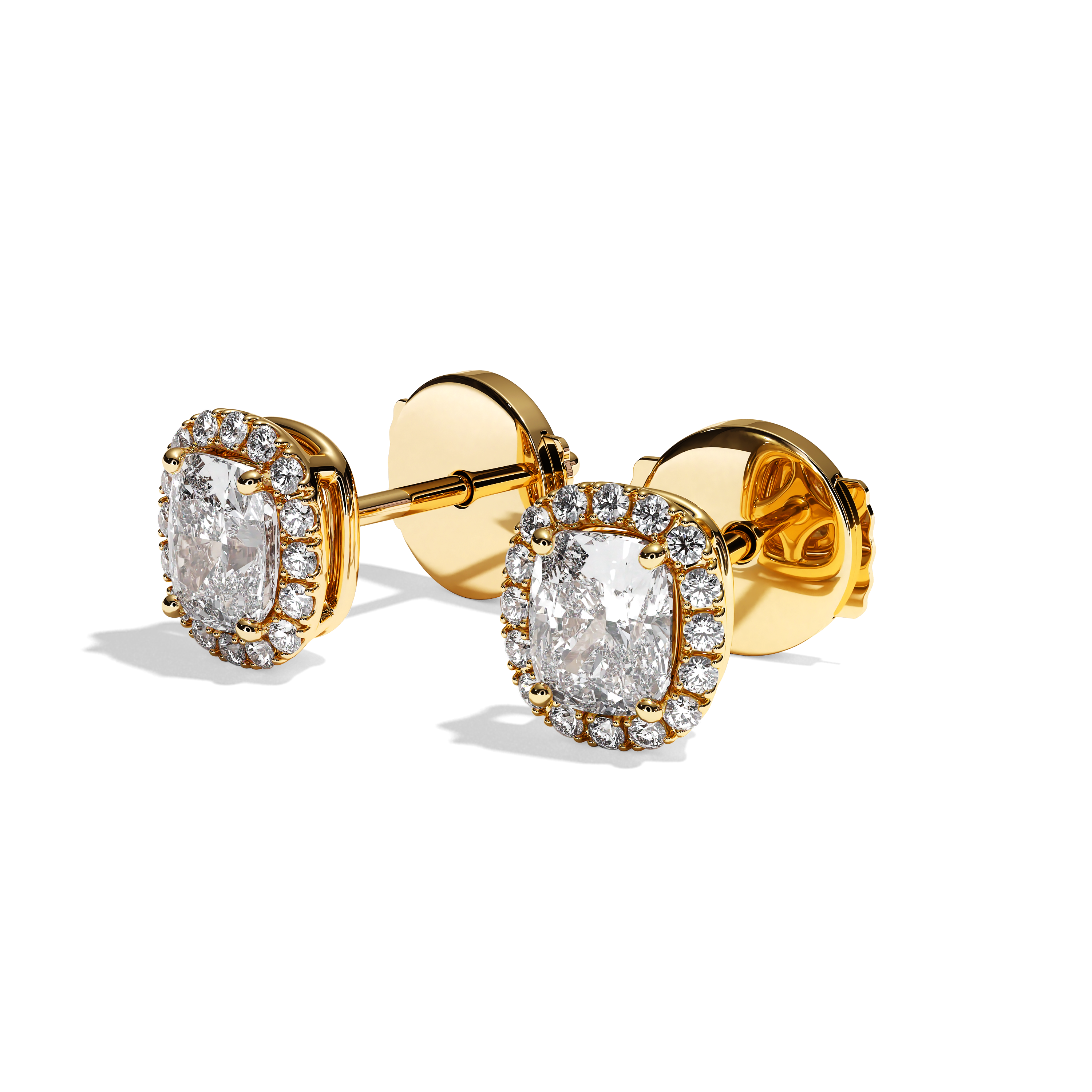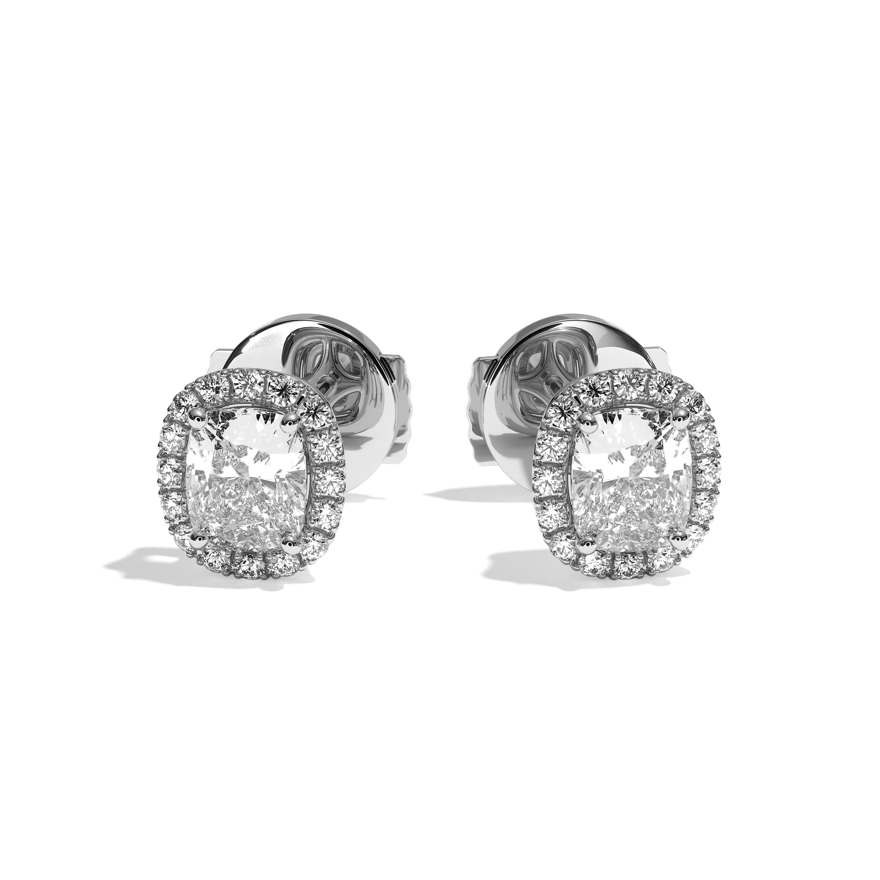Leur sertissage dit « grain » souligne parfaitement le rendu de la taille du coussin des diamants de centre et y laisse rentrer la lumière.