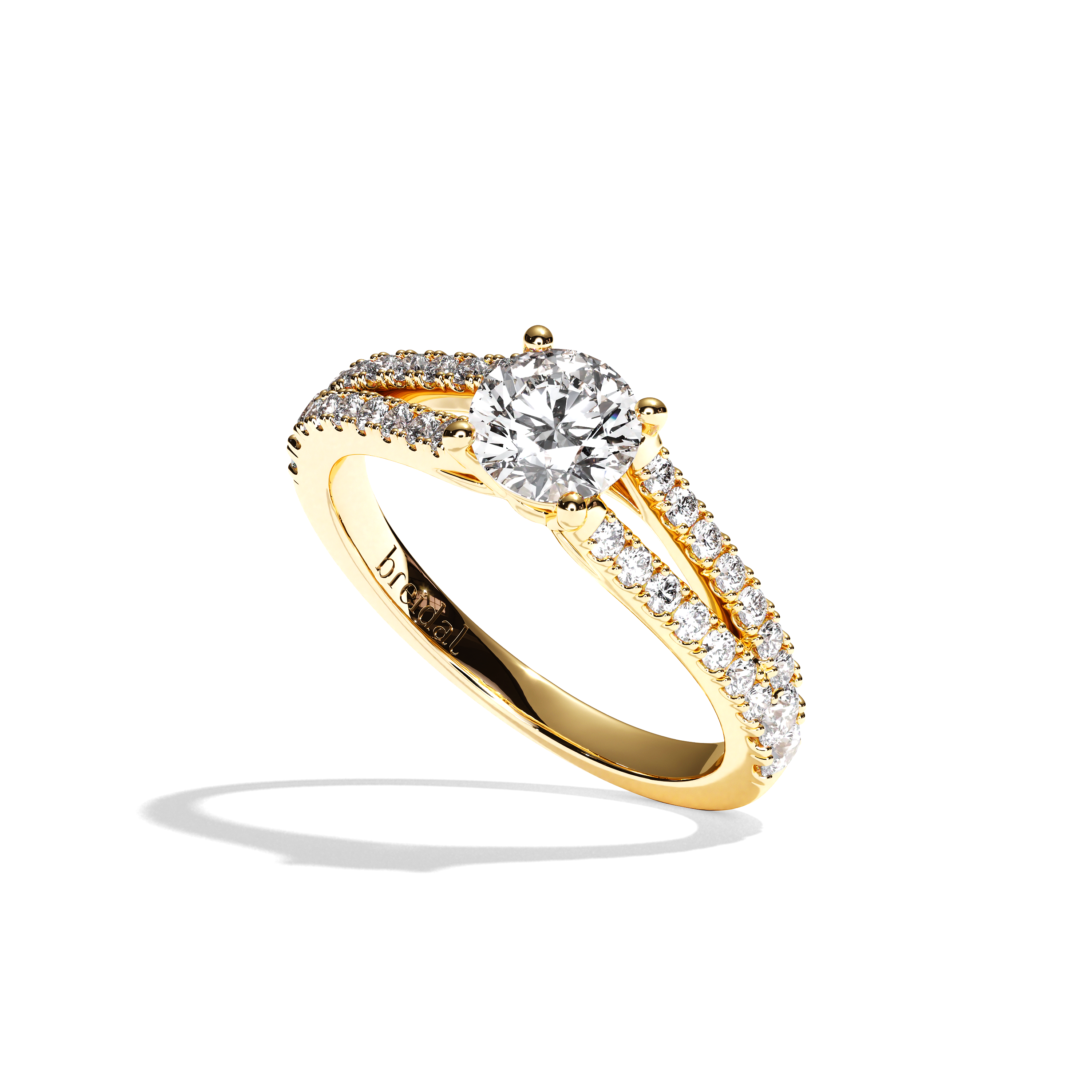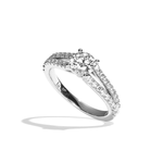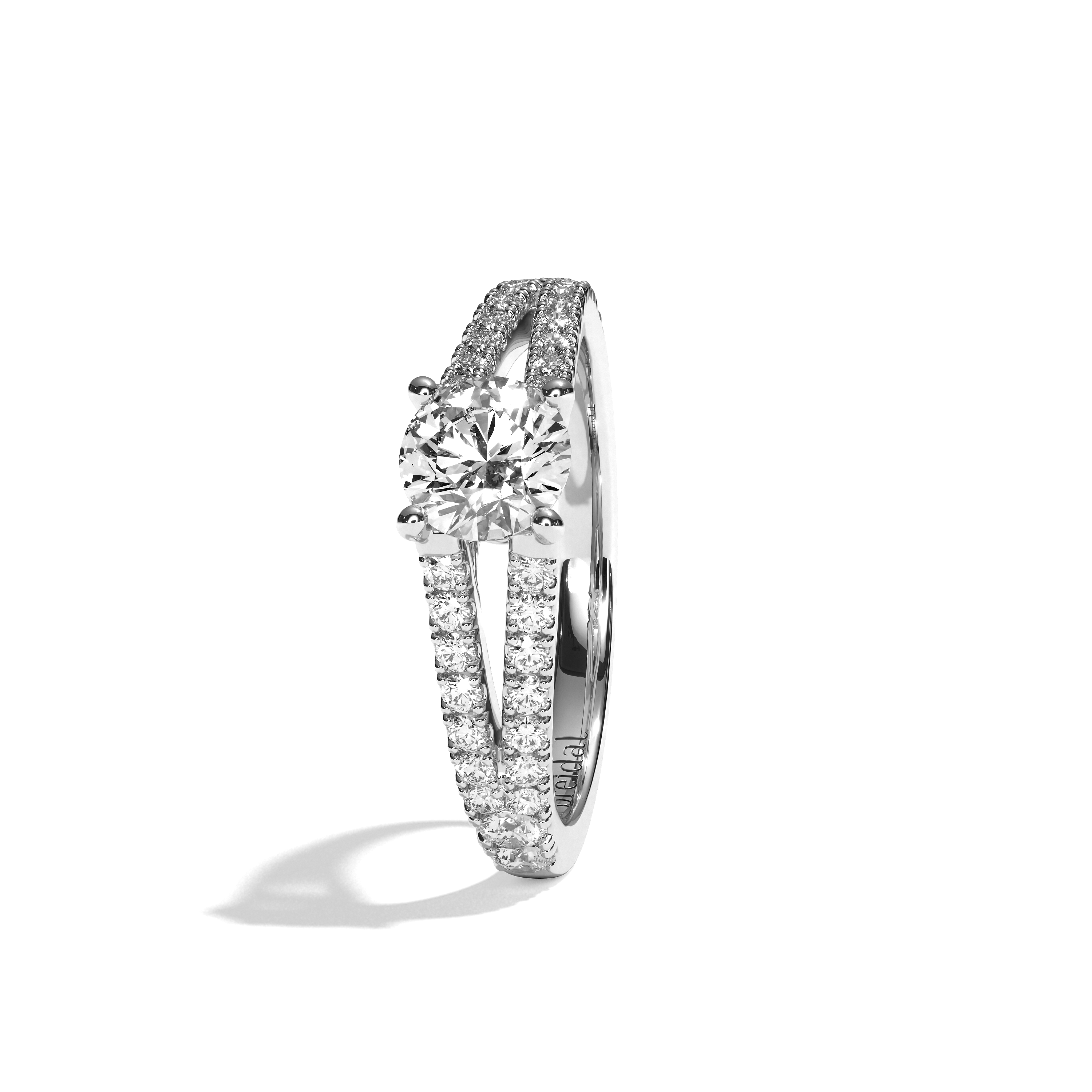 Le modèle L'Idéaliste est une bague de fiançailles remarquable, ornée d'un diamant central rond taille brillant qui capte la lumière pour un éclat intense.
